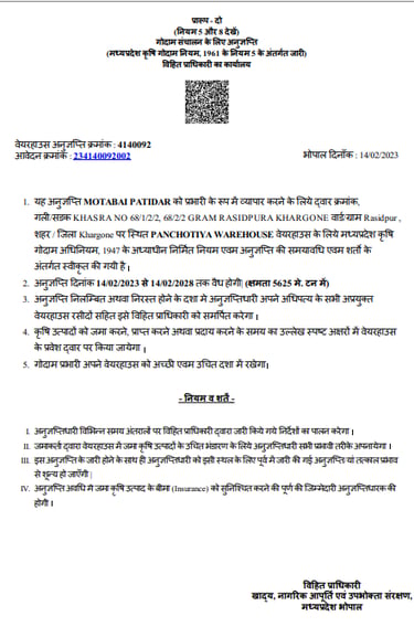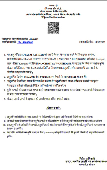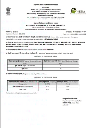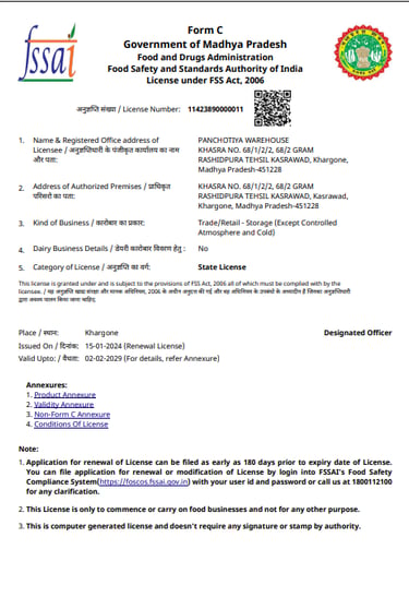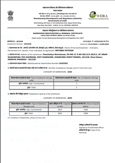 At Panchotiya Warehouse, we maintain the required registrations and licenses to support safe and professional operations. Our documents include WRDA registration, FSSAI licence, warehouse licence, and Geader licence. Copies of these certificates are available on request.